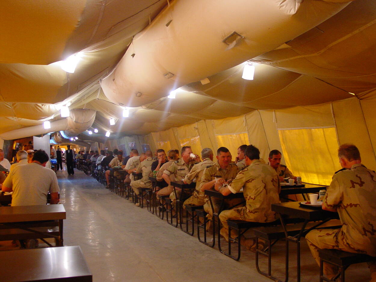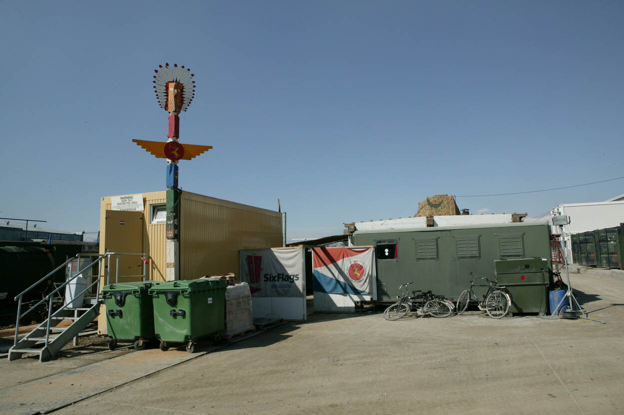 Het Chinook-detachement zit vlakbij de flightline, zoals in latere jaren het hele Nederlandse kamp. “We konden alles lopen. Het KCT had een eigen ops area, afgesloten van de rest met concertina’s. Voorafgaand aan een missie, ging de betreffende groep er ook in isolatie.”