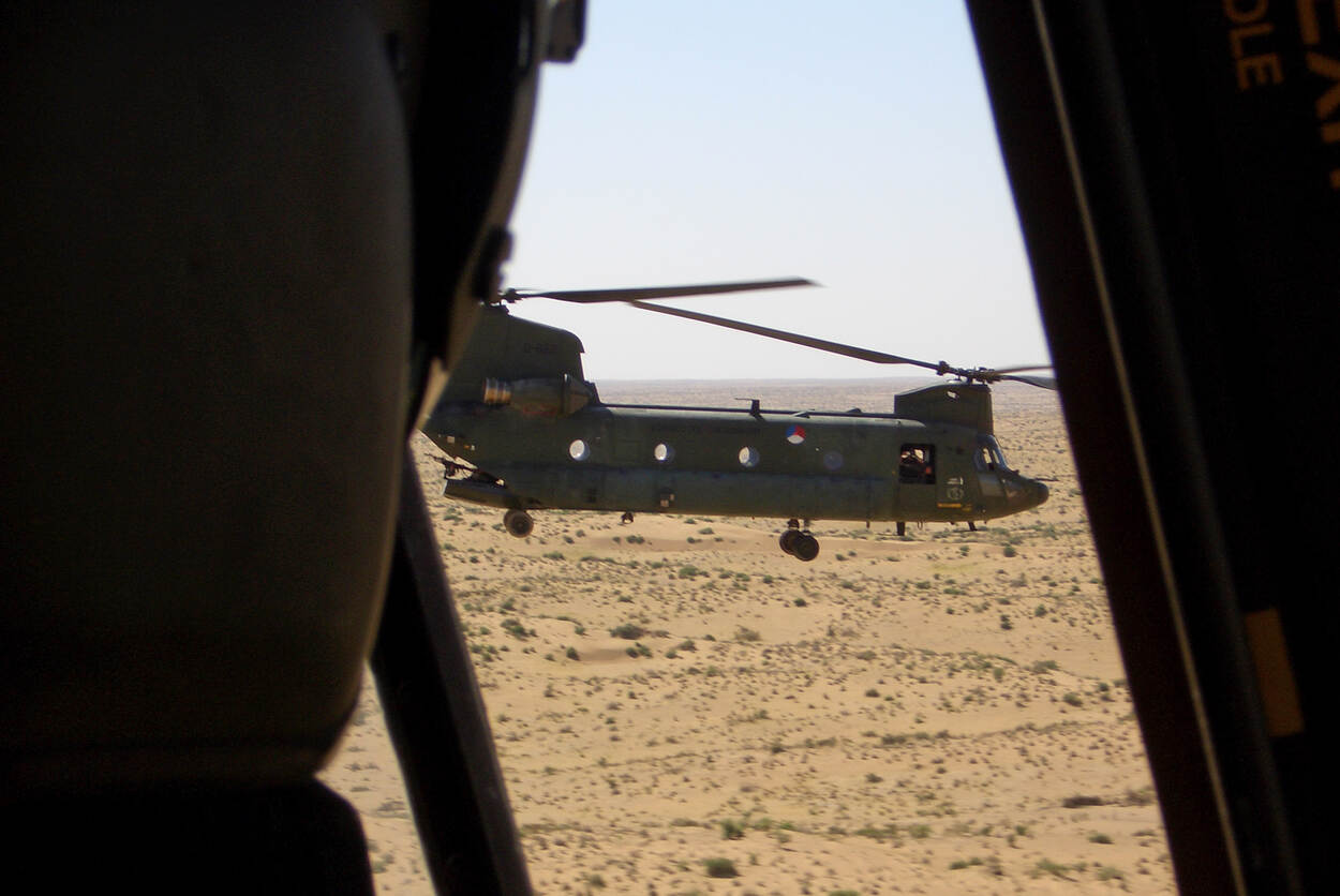 “We werkten in die tijd wel heel nauw samen met 11 Luchtmobiele Brigade. Met het KCT moest dat nog wel even vorm krijgen. Dat proces liep gelukkig goed. Voor mutual support vlogen we altijd met twee Chinooks: een landt, de ander beschermt met drie MAG-machinegeweren en daarna vice versa. Wij vlogen hard en laag, altijd andere routes. Onze veiligheid zat in being unpredictable.”