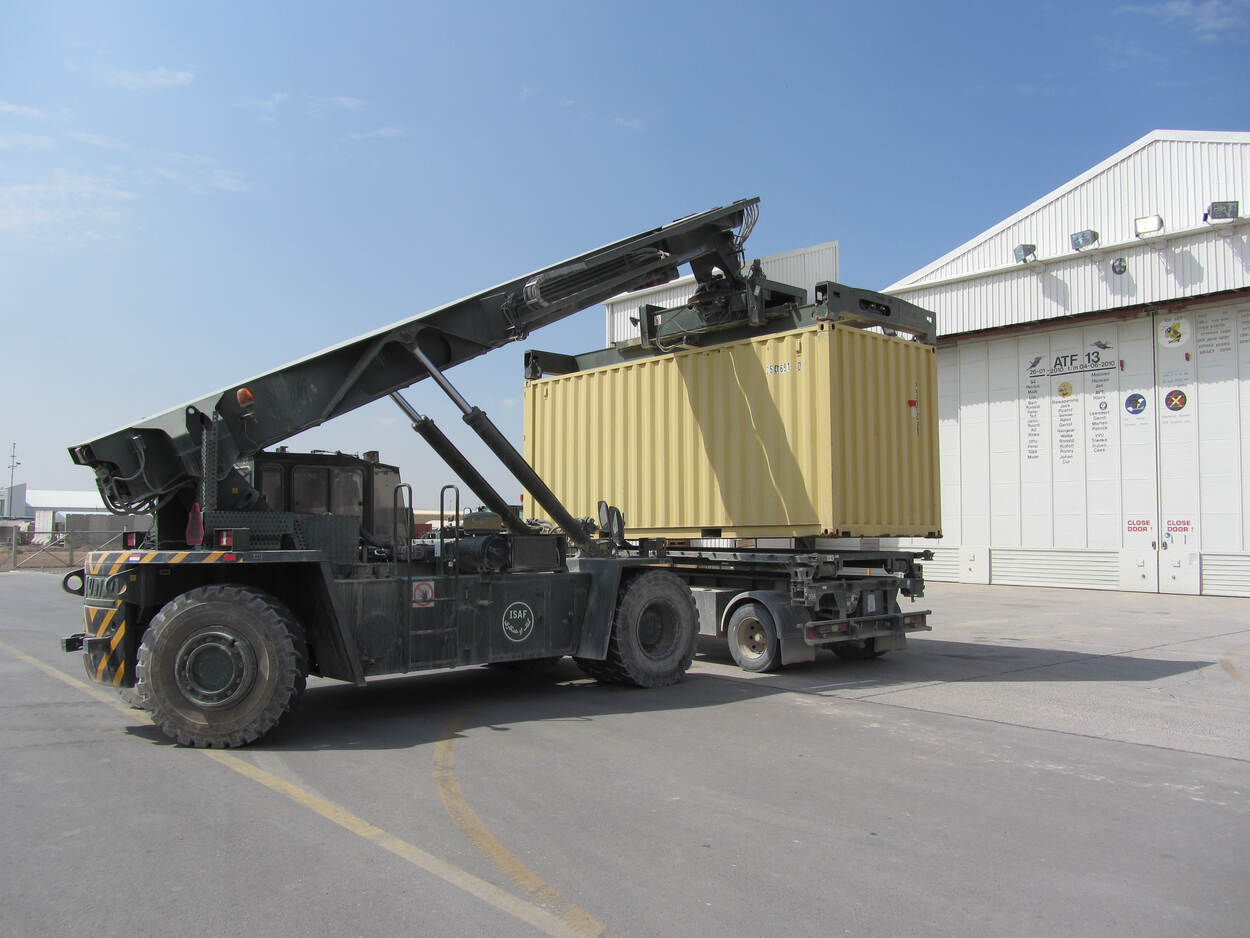 De verhuizing van KAF naar MeS is over de weg te gevaarlijk. Daarom verplaatsen ingehuurde Antonovs tachtig zeecontainers over een afstand van zo’n zeshonderd kilometer. “MeS was rustiger en veiliger. We hebben niet een keer hoeven schuilen. Dat was vooraf ook wel bekend.”