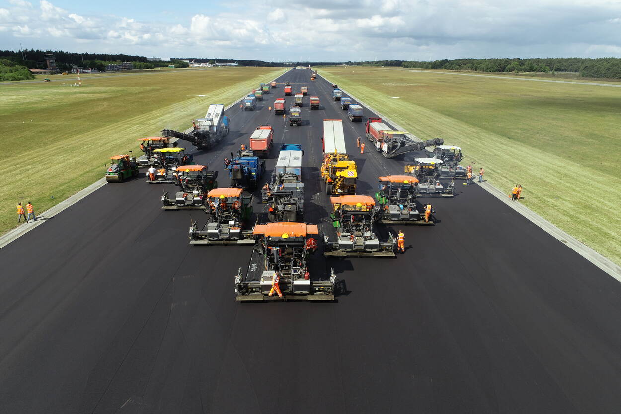 80.000 vierkante meter opnieuw asfalteren: een mega klus die imposante beelden oplevert. De renovatiewerkzaamheden aan de start- en landingsbaan van Vliegbasis Woensdrecht die medio mei gestart zijn lopen nog tot 15 juli.