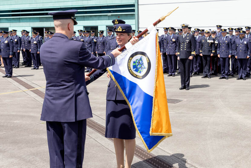 De oprichtingsceremonie vond plaats op Vliegbasis Gilze-Rijen. Luitenant-kolonel Dafna Dempsey, voormalig commandant 299 Squadron, nam daarbij het commando over HWC in ontvangst. Kapitein-luitenant ter zee Peter Riemens gaf de vlag van het 7 Squadron terug aan commandant DHC. Waarop Adang vervolgens de vlag van het O&S Squadron aan de nieuwe commandant majoor Jeroen van Asperen overhandigde. Foto: Studio 38c