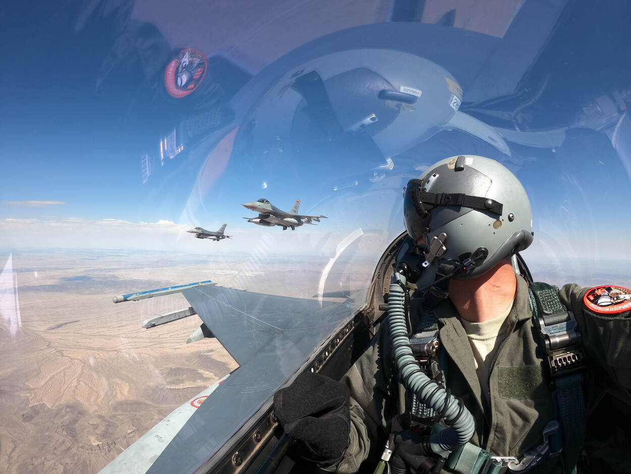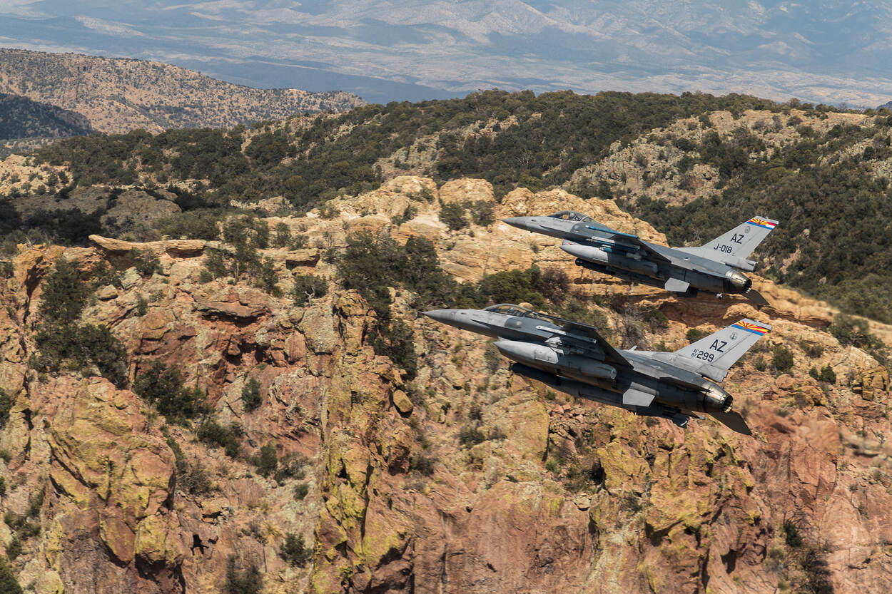 Naast flight safety werd er uiteraard ook veel gefotografeerd. Vanuit de lucht. “Ik heb gevlogen in de C-17, C-130, F-16 en de T-38. Deels met een-op-een-begeleidng van een Amerikaanse instructeur. In Amerika kan je zulke mooie dingen maken. Zij hebben alles in honderdvoud en het luchtruim is een stuk groter. Je kunt hartstikke laag en hard vliegen. En de achtergrond is toch een stuk mooier en gevarieerder dan het platte Nederland.”