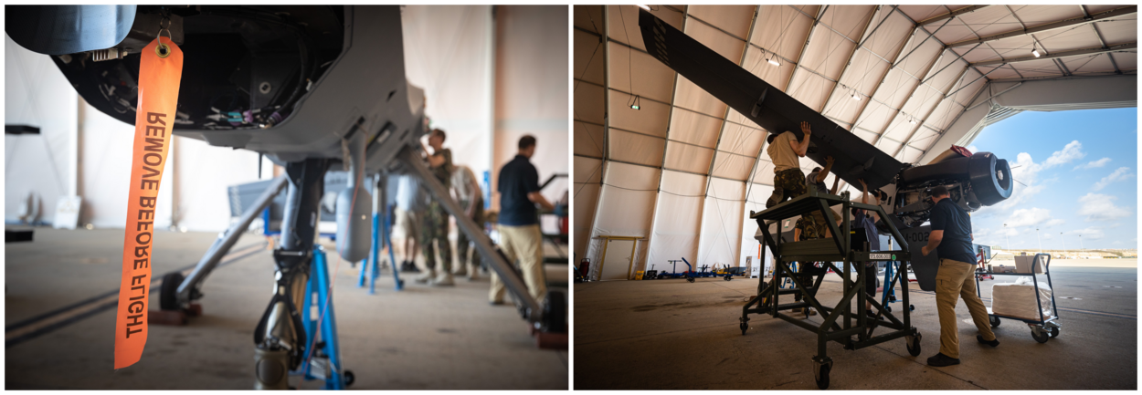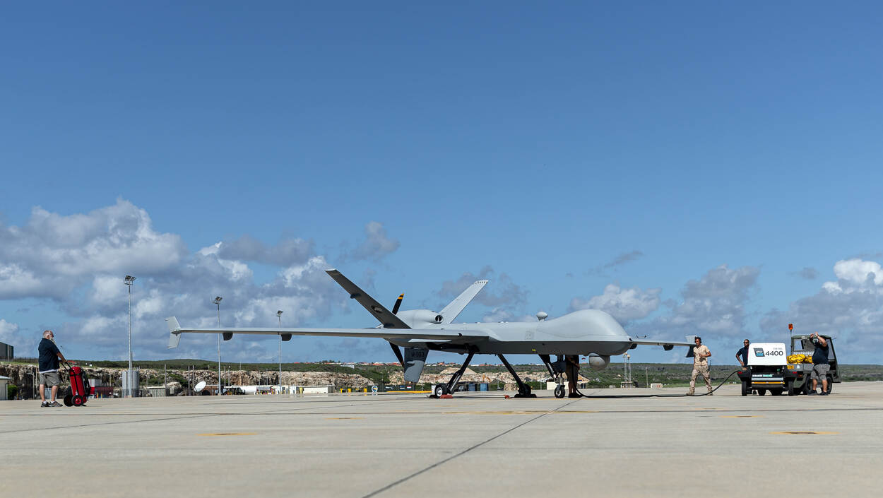 De MQ-9 wordt voorbereid op een nieuwe oefenvlucht op de Forward Operating Location op Curaçao.