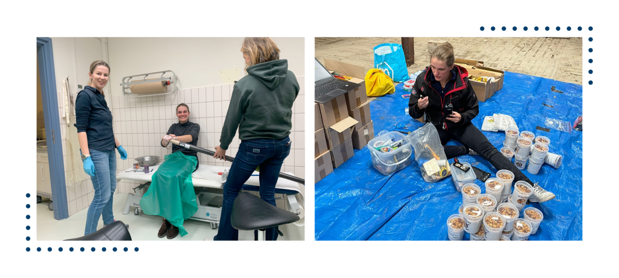 Dijkstra krijgt ‘een tweede huid’ op haar handen aangemeten. De siliconen-laag helpt blaren voorkomen. Rechts: 6.500 kilocalorieën moeten dagelijks worden genuttigd. Er gaan onder meer heel wat bakken nootjes mee. Foto: uit privécollectie