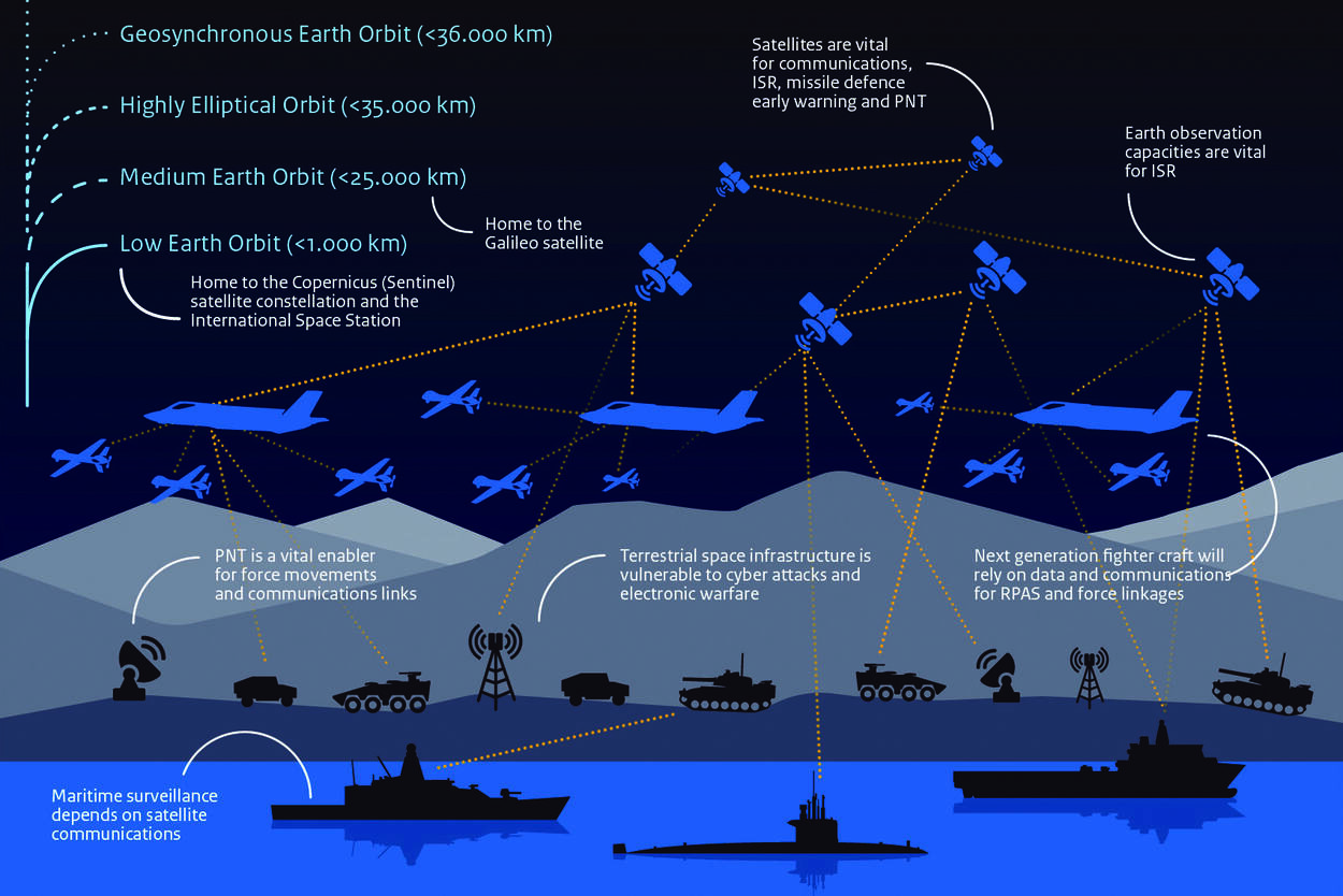 Strategisch adviseur bij het Directoraat-Generaal Beleid Genemans schrijft in de Defensie Ruimteagenda dat ons optreden hoog hierboven altijd een kwestie van samenwerking zal zijn. Sowieso bezit ons land geen eigen operationele satellietcapaciteit en zijn we voor de inzet bij toekomstige operaties sterk afhankelijk van coalitiepartners en/of commerciële partijen.