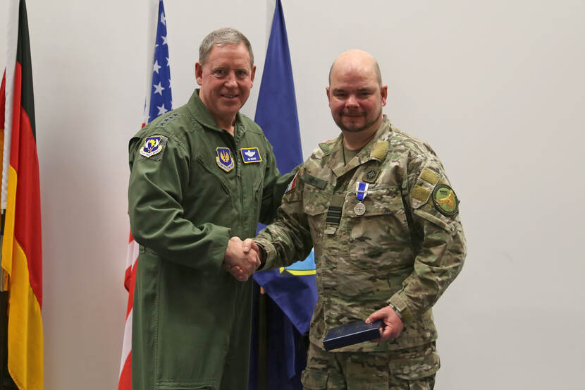 Luitenant-kolonel Chris Heijnen ontving op 24 februari de NATO Meritorious Service Medal; precies een jaar na de Russische inval in Oekraïne. Heijnen ontving deze hoge NAVO- onderscheiding voor het op uitstekende wijze uitvoeren van zijn taken in het kader van de crisis in Oekraïne. Dat deed hij als Branch Head Strategy van de NATO Command Structure Joint Force Air Component (NCS JFAC). Hij kreeg het eremetaal uit handen van generaal James B. Hecker, de huidige Amerikaanse commandant van het Allied Air Command (AIRCOM) van de NAVO. De uitreiking vond plaats op het AIRCOM-hoofdkwartier op de Amerikaanse vliegbasis Ramstein in Duitsland. Foto: AIRCOM