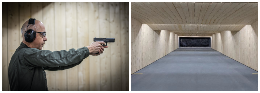Om aan de veiligheidseisen van Defensie te voldoen, werden op de civiele baan in Leeuwarden enkele aanpassingen gedaan. Zo werden de zijwanden betimmerd en zijn er extra beveiligingslampen aangebracht. Eerder was het ventilatiesysteem al aangepakt. SISL-penningmeester Paul Hoekstra: “Wij vinden het eervol dat de luchtmacht onze banen gebruikt. Onze stichting draagt de krijgsmacht een warm hart toe.” Commodore van Deventer had de eer om het eerste schot namens Defensie te lossen. Foto’s: sergeant-majoor Jan Dijkstra en Air Combat Command