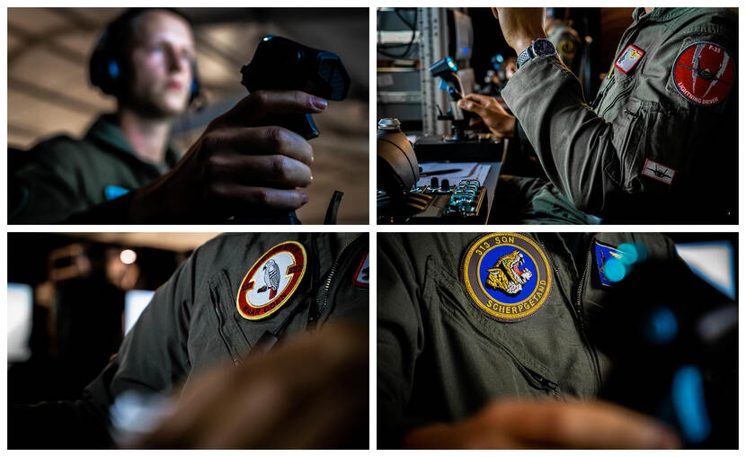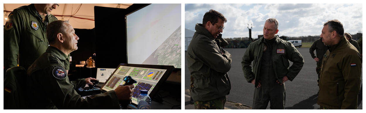 Om de digitale oorlog helemaal compleet te maken, is er ook vliegend personeel actief. Twee Duitse voormalige Tornado-vliegers beheren het geheel van twaalf zogenoemde – generic – vliegsimulators; dus niet gebaseerd op één specifiek vliegtuigtype. Daarop vliegen acht Duitse Eurofighter-(leerling-)vliegers en twee Nederlandse F-16- en evenzoveel F-35-vliegers. Een van hen is kapitein Guido van 313 Squadron. “Juiste communicatie is in alle gevallen cruciaal. Het CRC [Control and Reporting Center] moet ons op de juiste manier aansturen, wij moeten op onze beurt het CRC voeden met de juiste informatie van onze vlucht zodat zij verder kunnen bepalen wat er moet gebeuren. Als je tijdens een oefening als deze niet met vliegers kunt praten, mis je een stuk essentiele training.”