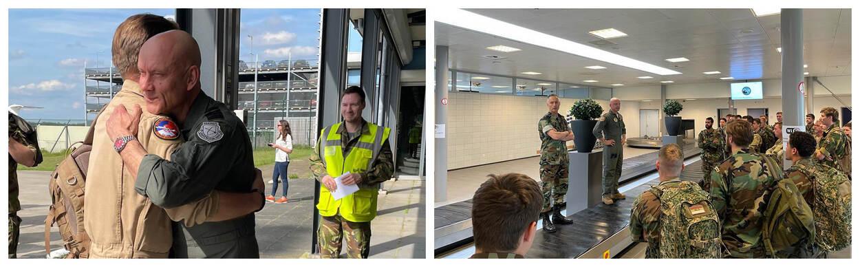 Zondag 30 april komen de laatste militairen terug uit Jordanië na hun plotselinge evacuatiemissie in Soedan. Luitenant-generaal Steur ontvangt ze in de passagiersterminal op Vliegbasis Eindhoven. Onder hen detachementscommandant luitenant-kolonel Theo Spijksma. Foto’s: Defensie