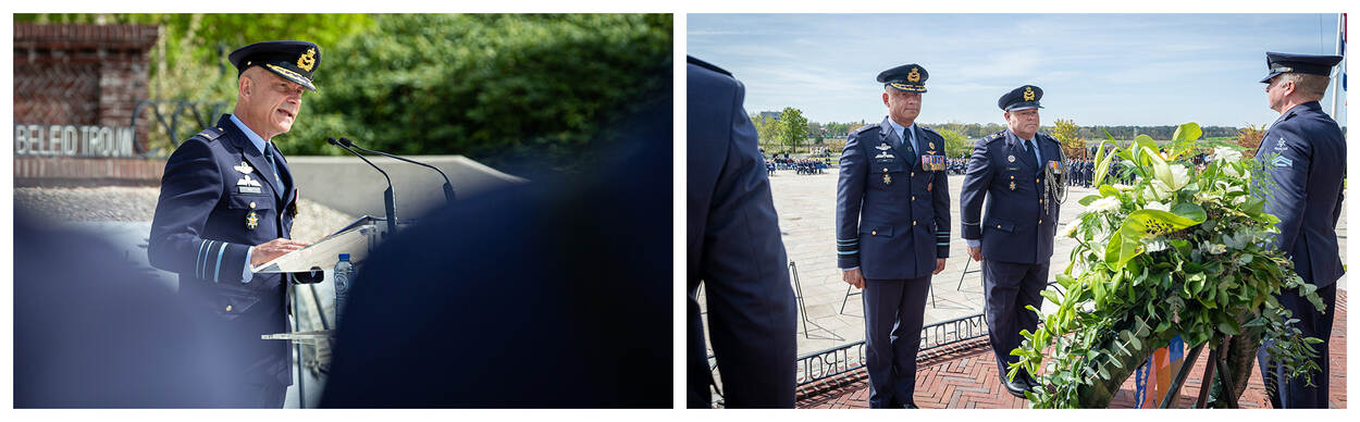 Steur voor het eerst als Commandant Luchtstrijdkrachten op de 4 mei-herdenking bij het Monument voor Gevallen Vliegers op de voormalige Vliegbasis Soesterberg, samen met Luchtmachtadjudant Terry Venhovens. Foto’s: korporaal Gregori Fréni