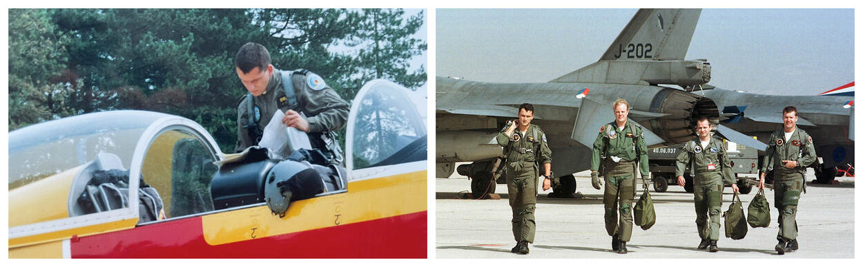 Links Steur in zijn tijd bij de Elementaire Militaire Vlieger Opleiding (EMVO) op Vliegbasis Woensdrecht. Rechts met collega-vliegers van 311 en 312 Squadron tijdens de NATO Air Meet op de Spaanse vliegbasis Zaragoza in september 1998.