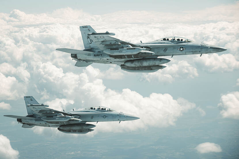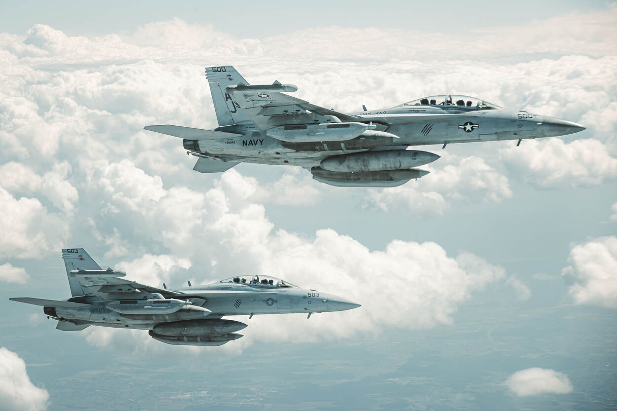 De vloot van A300 MRTT’s op Eindhoven is inmiddels aardig gegroeid. Foto: MMU Deelnemers aan ADE zijn volgens Baron anders dan die van dagelijkse trainingen. Als voorbeeld deze EA-18 Growlers van de US Navy die gespecialiseerd zijn in suppression of enemy air defence. Die vlogen echter hoofdzakelijk in de Zuidelijke LFE’s. Foto: sergeant Jasper Verolme