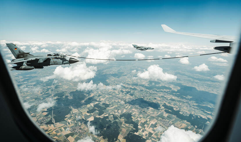 Voor de oefening voorzag de Luftwaffe een Tornado en een A400M van een speciale staart. De A400M is daarmee zelfs naar de VS gevlogen voor de aankondiging van ADE. Foto: Christian Timmig Zonder brandstof geen oefening. Voor zoveel fighters tijdens ADE zoals deze Duitse Tornado’s, zijn veel tankvliegtuigen nodig. De MMU leverde er dagelijks drie. Foto: sergeant Jasper Verolme