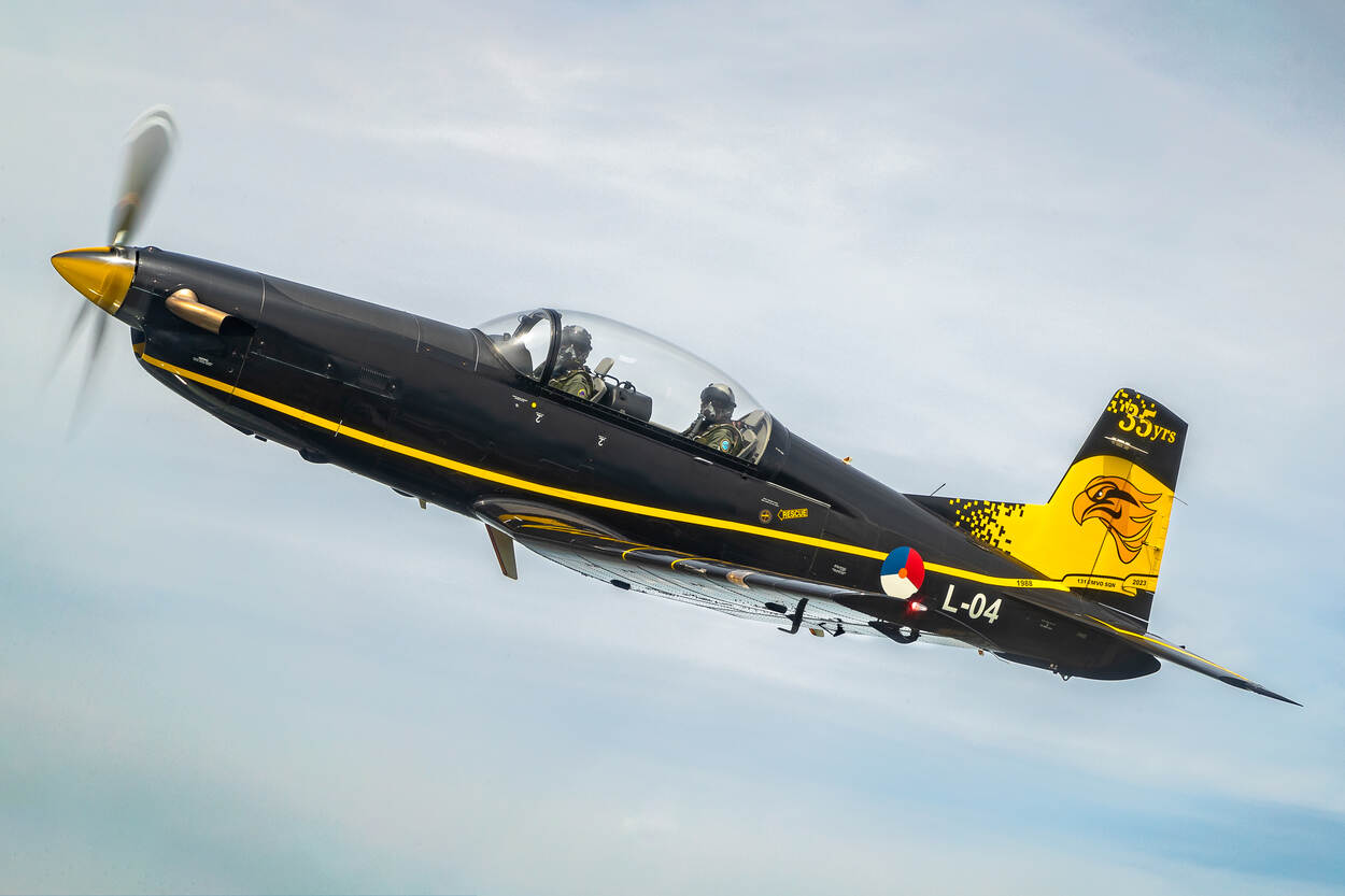 Technisch medewerker van 131 Squadron Eric Huffmeijer tekende (voor) het ontwerp dat samen met schilders van 980 Squadron op het lesvliegtuig kwam. Inmiddels is een tweede PC-7 van deze kleuren voorzien. Foto: sergeant-majoor Cristian Schrik