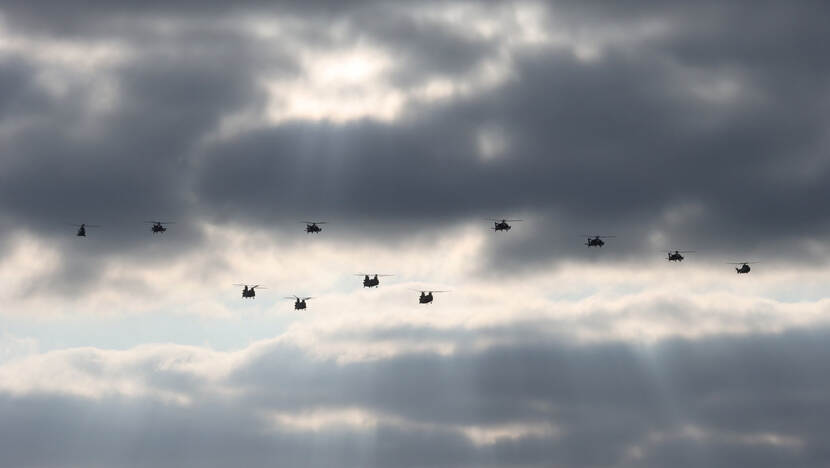 Een beeld dat je niet vaak ziet: elf toestellen van het Defensie Helikoptercommando (DHC) in formatie. De Apaches, Chinooks en Cougars kwamen op 2 juni terug van de drieweekse oefening TAC Blaze in Groot-Brittannië.