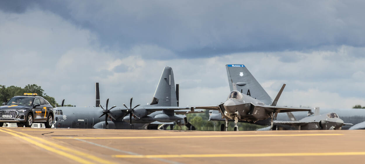 De RIAT is het grootste militaire vliegfestijn ter wereld: Nederlandse F-35’s volgen de Follow me-auto tussen een Amerikaanse B-52, C-130 en MV-22 door.