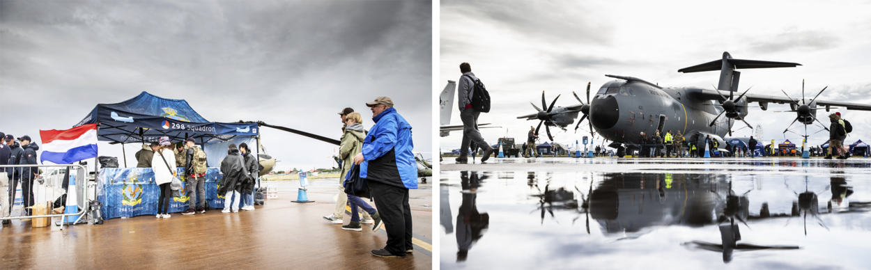 De RIAT werd dit jaar geplaagd door slecht weer zoals te zien bij de stand van 298 Squadron en door de plassen water bij een Airbus A400M.