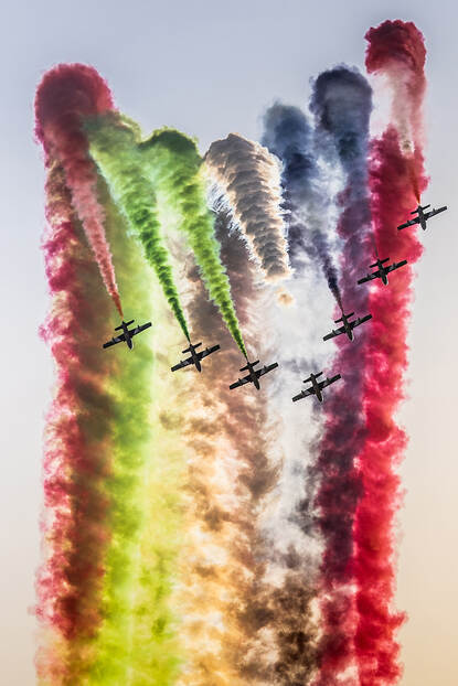 Bijzonder kleurenpallet neergelegd door demonstratieteam Al Fursan uit de Verenigde Arabische Emiraten.