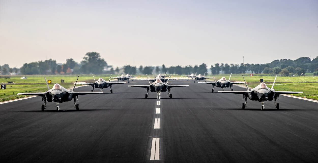 Bijna zeven maanden is er gewerkt aan de startbanen van Vliegbasis Leeuwarden, zie deze rubriek in de vorige uitgave van de Vliegende Hollander en in die van januari-februari. F-35’s en het personeel van 322 Squadron opereerden in die tijd grotendeels niet vanaf hun thuisbasis. In januari en februari was een deel in Malbork in Polen voor de enhanced Air Policing-taak van de NAVO. Sinds afgelopen april lag het vliegverkeer op Leeuwarden volledig stil en was Vliegbasis Volkel de tijdelijke thuishaven. In mei en juni stond het squadron met een aantal toestellen ongeveer een maand op vliegbasis Ørland in Noorwegen voor de oefening Arctic Challenge Exercise. Op 25 augustus landden alle toestellen van 322 weer op Leeuwarden. Dat leverde deze zogenoemde Elephant Walk op, waarbij alle (beschikbare) toestellen achter elkaar op de baan rijden. Foto: sergeant-majoor Jan Dijkstra
