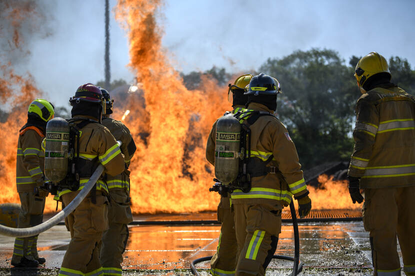Brandweerpersoneel van het 424th Air Base Squadron (ABS) van de Amerikaanse vliegbasis Chièvres in België oefende midden juni op Vliegbasis Woensdrecht.