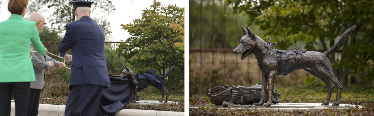 Diensthonden zijn samen met hun geleiders een onmisbaar ‘wapen’ bij de uitvoering van militaire operaties, waar ook ter wereld. De luchtmacht zet ze dan ook al meer dan zeventig jaar in. Als eerbetoon aan de viervoeters onthulde het Commando Luchtstrijdkrachten op 2 oktober, daags voor dierendag, een monument op de voormalige Vliegbasis Soesterberg.