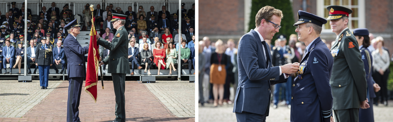 Luitenant-generaal Mario Verbeek droeg op 1 september het commando van het Defensie Ondersteuningscommando (DOSCO) over aan luitenant-generaal (CLAS) Jan-Willem Maas. Verbeek kreeg bij zijn afscheid het Ereteken voor Verdienste in goud uit handen van staatssecretaris van Defensie Christophe van der Maat. Verbeek gaat met leeftijdsontslag militairen. Foto’s: sergeant Gregory Fréni