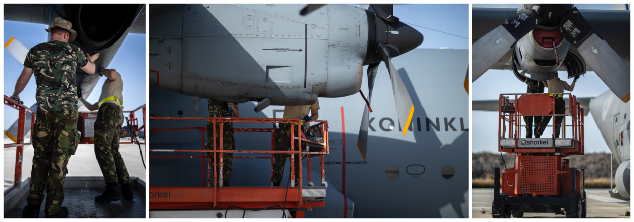 Het motortje van de ‘Snorkel’ slaat aarzelend aan op het militaire deel van vliegveld Paphos. Uiterst voorzichtig rijden twee monteurs de gehuurde – toepasselijk oranje – schaarlift onder een van de motoren van de C-130. In de schaduw, in de wind… de beste plek om op het heetst van de dag te staan. “En het is hier geen kippenhok”, roept een monteur lachend naar beneden. Hij doelt op de drukte in de hal die het Nederlandse detachement toegewezen heeft gekregen door host nation Cyprus. In die ruimte is inderdaad veel te doen, staan een hoop spullen, lopen verschillende eenheden kriskras door elkaar. Gecoördineerd, dat wel, maar als je van rust houdt sta je op de apron meer op je gemak.