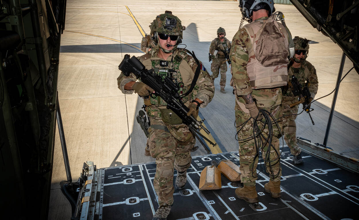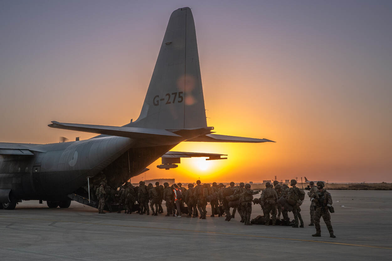 Een van de beide loadmasters van de C-130 van 336 Squadron steekt zijn duim omhoog naar de wachtende mariniers op het platform: ze mogen instijgen. Tientallen mariniers met zware bepakking lopen in twee rijen het transporttoestel in. Zij worden even later afgezet op een ‘luchthaven in de regio’ om een evacuatieoperatie uit te voeren van een specifieke doelgroep die zelf het betreffende land niet meer kan verlaten. Net zoals bijvoorbeeld in werkelijkheid gebeurde in Soedan en Kaboel.