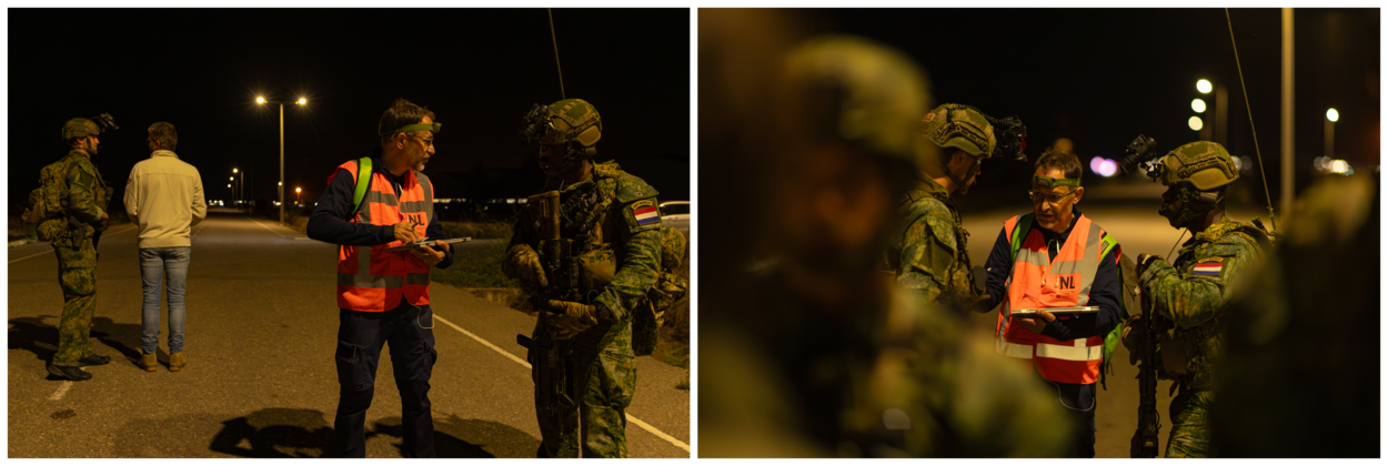 SCOT’ers Jopy Willems en Rolph Petra van Buitenlandse Zaken controleren de identiteitsbewijzen van de arriverende evacuees. De beide SCOT’ers kregen uitdagende casussen, zoals een verlopen paspoort of een typefout in een naam. Hun collega’s in Nederland doen ook mee aan de oefening, waardoor ze – net als in het echt – hen met de satelliettelefoon kunnen bellen om namen in de systemen te verifiëren. Willems blikt na afloop enthousiast terug. “De oefening was supernuttig. Het was heel leuk om met Defensie samen te werken. Binnen no time stond onze controlepost er. We werden helemaal ontzorgd. Dat was superfijn, want zo konden we ons volledig focussen op onze hoofdtaak: de ID-controle. De setting was zo levensecht, dat je meteen denkt: ‘dit is geen spel’. Ik heb er veel van geleerd.”