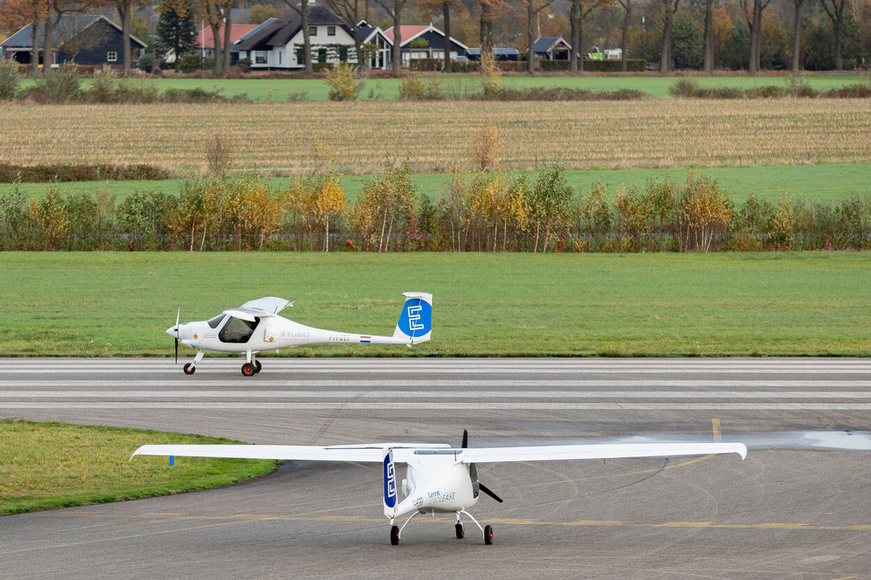 Hoewel de lucht inmiddels wat grijzer is geworden, is het weer nog goed genoeg om op te stijgen. Met tussenpozen van enkele minuten vertrekken de twee toestellen waarin Martijn en Stijn zich bevinden. Ondanks het verschil in motortype zijn de vliegeigenschappen precies dezelfde als bij een brandstofaangedreven toestel, vertelt mede-eigenaar van E-Flight Merlijn van Vliet. “Het imago van vliegen is natuurlijk geluid maken en CO2 uitstoten. Als je dan kan bewijzen dat we op Teuge ook oefenen zonder overlast is dat top.”