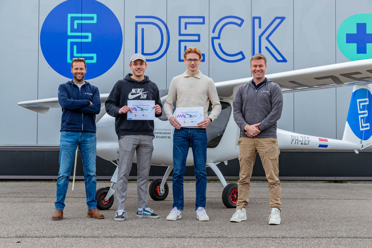 Martijn (midden links) en Stijn (midden rechts) nemen na hun vlucht een certificaat in ontvangst.