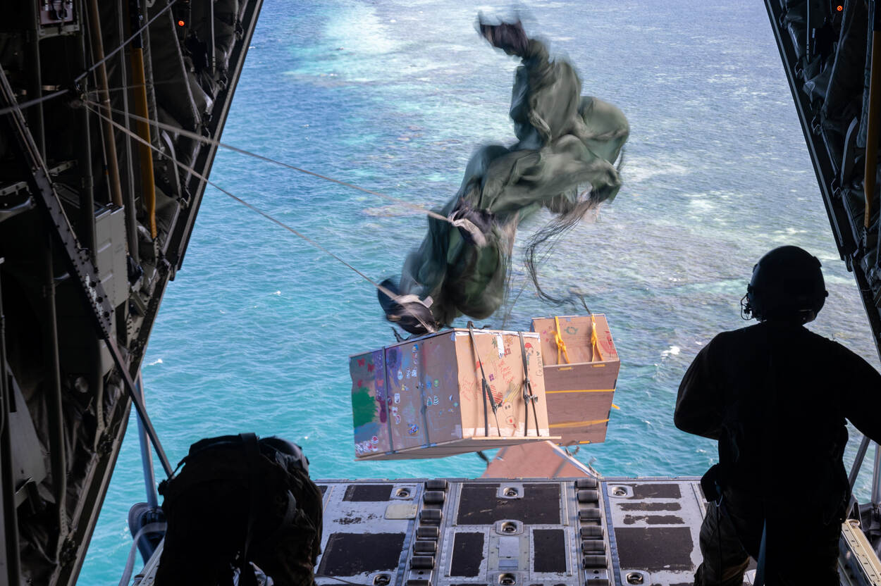 Vanaf een hoogte van driehonderd voet, zo’n honderd meter, vallen de ladingen dan op het strand of in het water. “Deze dropmethode vereist de nodige ervaring van de bemanningen omdat het afwerpen plaatsvindt met minimale gegevens van de drop-locatie en zonder contact met mensen op de grond.”