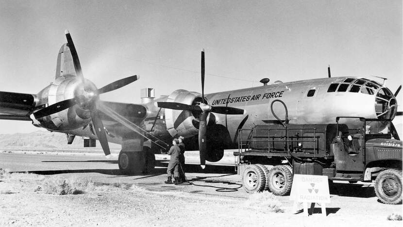 Een voorbeeld van een WB-29 Superfortress. Een exemplaar van het 54th WRS is in 1952 op zoek naar orkanen als de bemanning de zwaaiende bevolking op het Kapingamarangi-atol ziet, op bijna 1800 kilometer ten zuidoosten van Guam. Foto: USAF