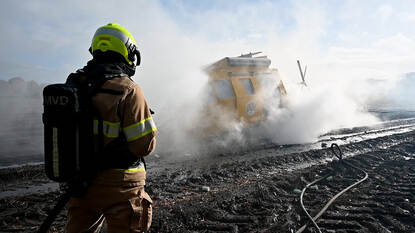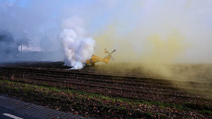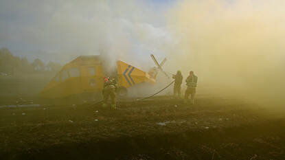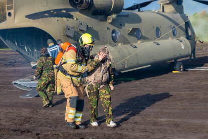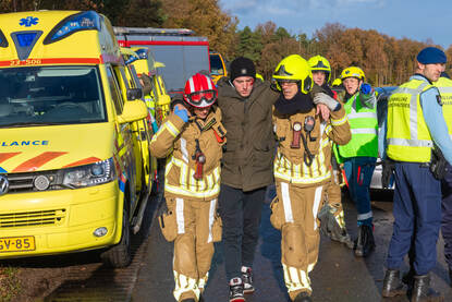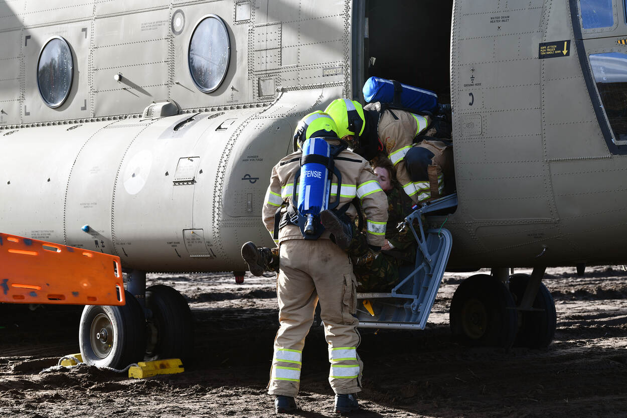 En alsof de bosbrand niet genoeg is, vindt er ook een – gesimuleerde – mid-air collision plaats tussen twee Chinooks die met de blusacties bezig zijn. Een bijkomende uitdaging voor alle instanties is dat één heli gesimuleerd op terrein van Defensie neerkomt en de ander in het aardappelveld van een boer. “De verantwoordelijkheden zijn dan verdeeld”, schetst ritmeester (reserve) Kelvin Hilgeholt. “Dit is een vrij extreem scenario, maar wel de beste leerschool voor áls we elkaar nodig hebben. Een oefening als deze vergt een zorgvuldige voorbereiding. We zijn er zo’n zes maanden mee bezig geweest. Je wilt zo volledig mogelijk zijn met de inzet van alle betrokken partners”.