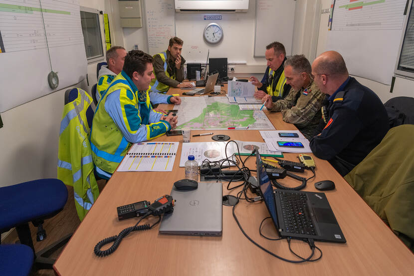 Overleg tussen de hoofdrolspelers van Wild Fire, met in het midden rechts majoor Olav Nieuwenhuis en links achterin ritmeester (r) Kevin Hilgeholt.