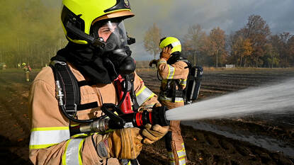 Met een temperatuur van krap 5 graden, wind, regen en rondwaaiende herfstbladeren, lijkt de zomer inmiddels heel ver weg. Maar niet in de omgeving van Weert, waar de Veiligheidsregio Limburg-Noord deed alsof het hartje zomer was. De oefening Wild Fire bracht rond Weert alle denkbare civiele hulpdiensten, de brandweer van vliegbasis Eindhoven, het Defensie Helikopter Commando, landmacht, Koninklijke Marechaussee en reservisten bij elkaar om een ramp van bijkans Bijbelse proporties te bestrijden.