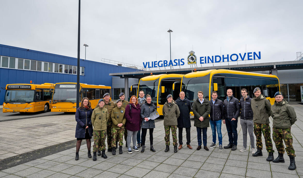 Vliegbasis Eindhoven beschikt sinds 18 december over twee elektrische platformbussen. Die zijn bedoeld voor passagiersvervoer van de militaire passagiersterminal naar de vliegtuigen op het platform en terug. De nieuwe bussen – rechts op de foto – vervangen twee verouderde dieselbussen. Volgens sergeant-majoor Remco Dekker die deel uitmaakte van de projectgroep die de bussen aanschafte, zijn de bussen een welkome vervanging. “Behalve dat ze een stuk duurzamer zijn, is ook het rijcomfort van de voertuigen van een ander niveau.” Op de foto alle betrokkenen van het project van zowel het Air Mobility Command als de leverancier. Foto: Frank van Beek