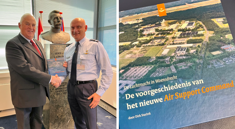 Een bijzondere boekpresentatie op de luchtmachtstaf in Breda op 6 december. Auteur luitenant-generaal b.d. Dirk Starink overhandigde hier ‘De voorgeschiedenis van het nieuwe Air Support Command’ aan Commandant Luchtstrijdkrachten luitenant-generaal André Steur.