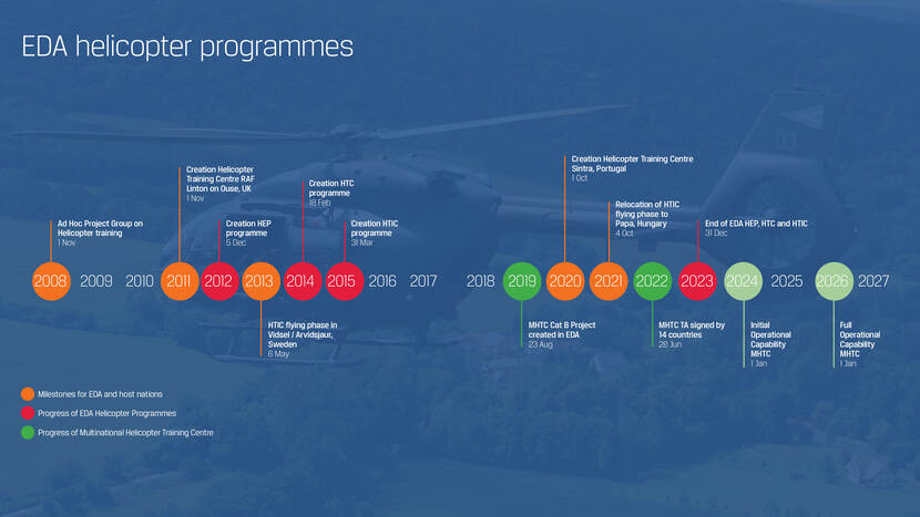 Bij het nieuwe trainingscentrum zijn momenteel veertien Europese landen aangesloten. Hun doel is het verbeteren van de internationale samenwerking tussen helikoptereenheden. Nederland is één van de aangesloten landen en het levert ook een wapeninstructeur voor de vaste staf van het MHTC. De samenwerking is gericht op het verbeteren van de Europese helikopter-interoperabiliteit en het verbeteren van bemanningen en gelinkt personeel in de tactieken van moderne oorlogsvoering en operaties. Met de drie eerdere EDA-opleidingsprogramma’s zijn tussen 2009 en 2023 2.325 vliegtuigbemanningsleden en 15.000 militairen getraind en opgeleid. Afbelding: EDA