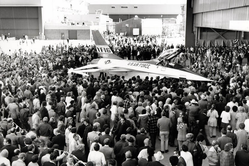 Het toestel komt ten overstaan van vele honderden genodigden aangetaxiet bij de fabriek van General Dynamics (nu Lockheed Martin) in Fort Worth, Texas. En maand later vliegt de Fighting Falcon – de bijnaam die het toestel later krijgt – voor het eerst.