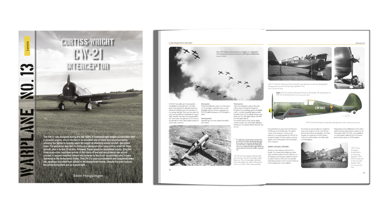 ‘Warplane No.13 – Curtiss-Wright CW-21 Interceptor’ met ISBN 9789464561548 is geschreven door Edwin Hoogschagen en uitgegeven door Lanasta, een imprint van Walburg Pers in Zutphen. De softback op formaat 22 x 27 cm telt 48 pagina’s, is geschreven in het Engels en is voorzien van enkele kleuren en vele honderden zwart-witfoto’s en –afbeeldingen. Het boek kost € 20,00 en is onder andere te bestellen bij de uitgever. Het boek is ook beschikbaar als eBook ePub voor € 9,99. Kijk voor meer informatie op www.walburgpers.nl.