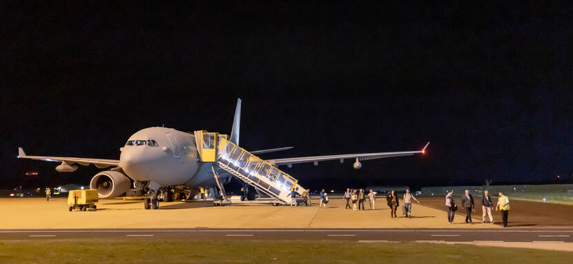 Foto boven: De eerste A330 MRTT is net geland op Vliegbasis Eindhoven. “Tot twintig minuten voordat we het Israëlisch luchtruim invlogen, hebben we nog bekeken of de veiligheidssituatie een landing toeliet”, vertelt de Nederlandse copiloot kolonel Cris van Dijk.
