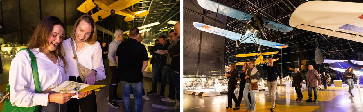 Mensen lopen door het Nationaal Militair Museum in Soesterberg en bekijken het programmaboekje.