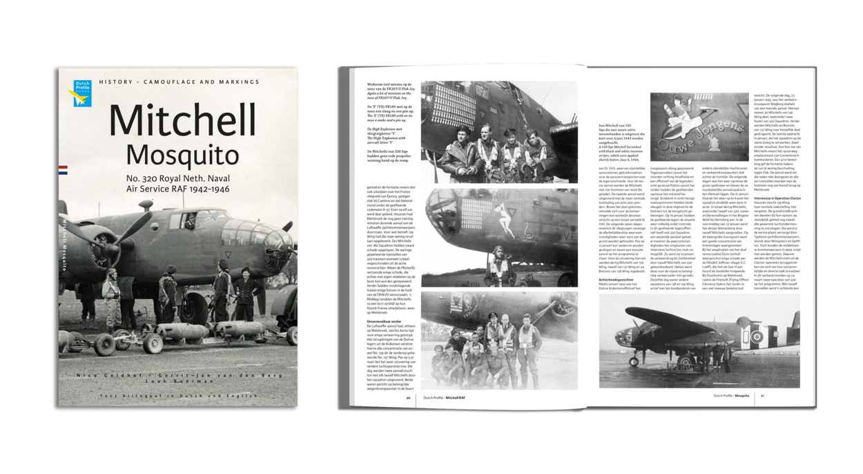 Mitchell en Mosquito – No.320 Squadron Royal Neth. Naval Air Service RAF 1942-1946’ met ISBN 9789490092504 is geschreven door Nico Geldhof, Gerrit-Jan van den Berg en Luuk Boerman en is uitgegeven door Dutch Profile Books. De soft back op formaat 21 x 29,5 cm telt 76 pagina’s, is voorzien van Nederlandse en Engelse tekst en van drie kleuren- en honderd zwart-witfoto’s en acht pagina’s kleurenprofielen. Het boek kost €17,95 en is onder andere te bestellen via www.dutchprofile.nl.
