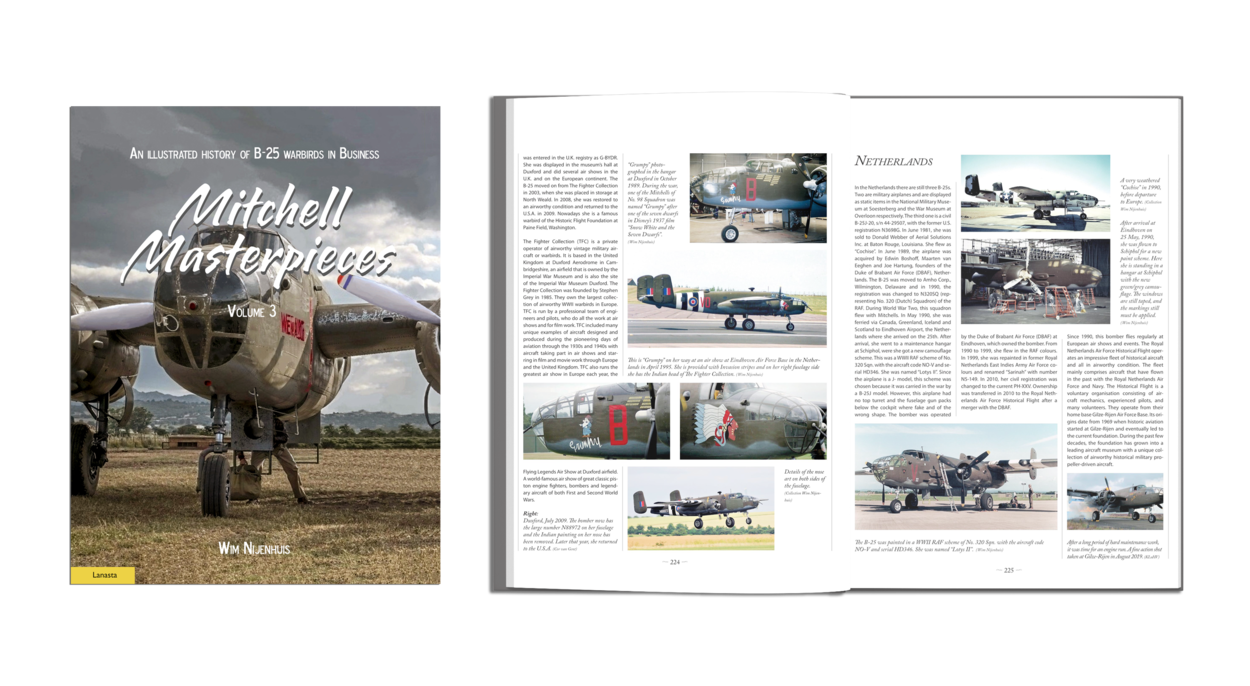 ‘Mitchell Masterpieces – Volume 3: An illustrated history of B-25 warbirds in Business’ Met ISBN 9789464560664, is geschreven door Wim Nijenhuis en uitgegeven door Lanasta, een imprint van Walburg Pers in Zutphen. De soft back op formaat 22 x 28,5 cm telt 256 pagina’s, is geschreven in het Engels en is voorzien van zo’n 750 foto’s waarvan de meeste in kleur. Het boek kost €34,99. Kijk voor meer informatie over dit boek en de andere twee delen uit deze serie van Nijenhuis op www.walburgpers.nl.