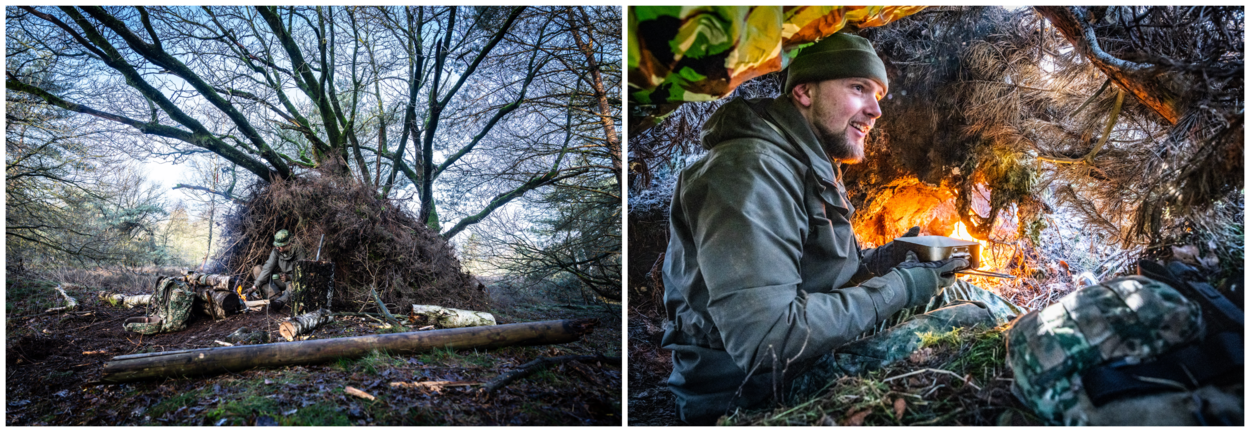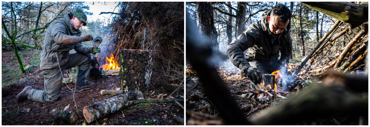 Op Kamp De Kiek leren de cursisten in de wildernis voor zichzelf zorgen. Ze moeten een vuur en een onderkomen maken met ter plekke gevonden materialen, de kledingdrills toepassen en voedsel uit de natuur vangen en opeten. Scholte: “Wat ze hiervoor meekrijgen, is naast de kleding die ze dragen, een poncho, een stuk touw, een zaag en een mes. Je kunt daarmee de poncho spannen, een draagzak maken om stukken hout te verplaatsen of een val maken.” Van dat laatste moet je volgens de specialist in Nederland niet te veel verwachten: “Met dertig strikken vang je hoogstens een konijn. Daarom hebben we iedereen vooraf een forel laten vangen, die ze vervolgens moesten doden en schoonmaken. Dat eerste deden sommigen met enige terughoudendheid.”