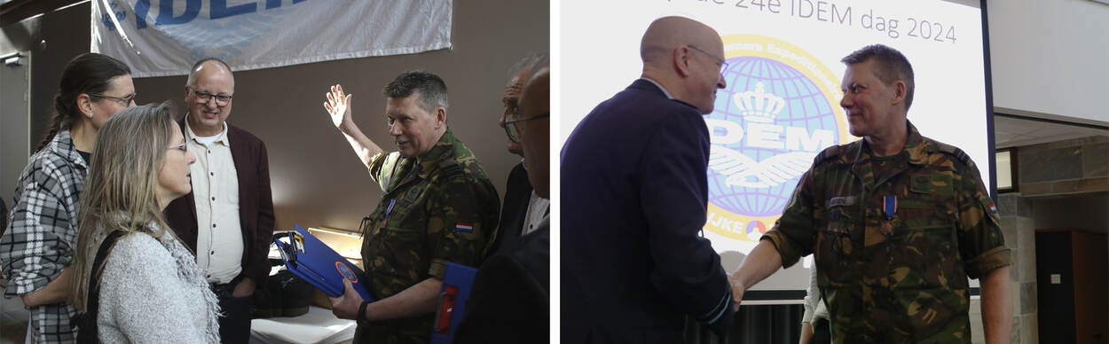 Majoor Marcel Jansen verwelkomt de mensen op IDEM-dag. Uit handen van PC-LSK generaal-majoor Robert Adang krijgt hij het Ereteken van Verdienste in brons.