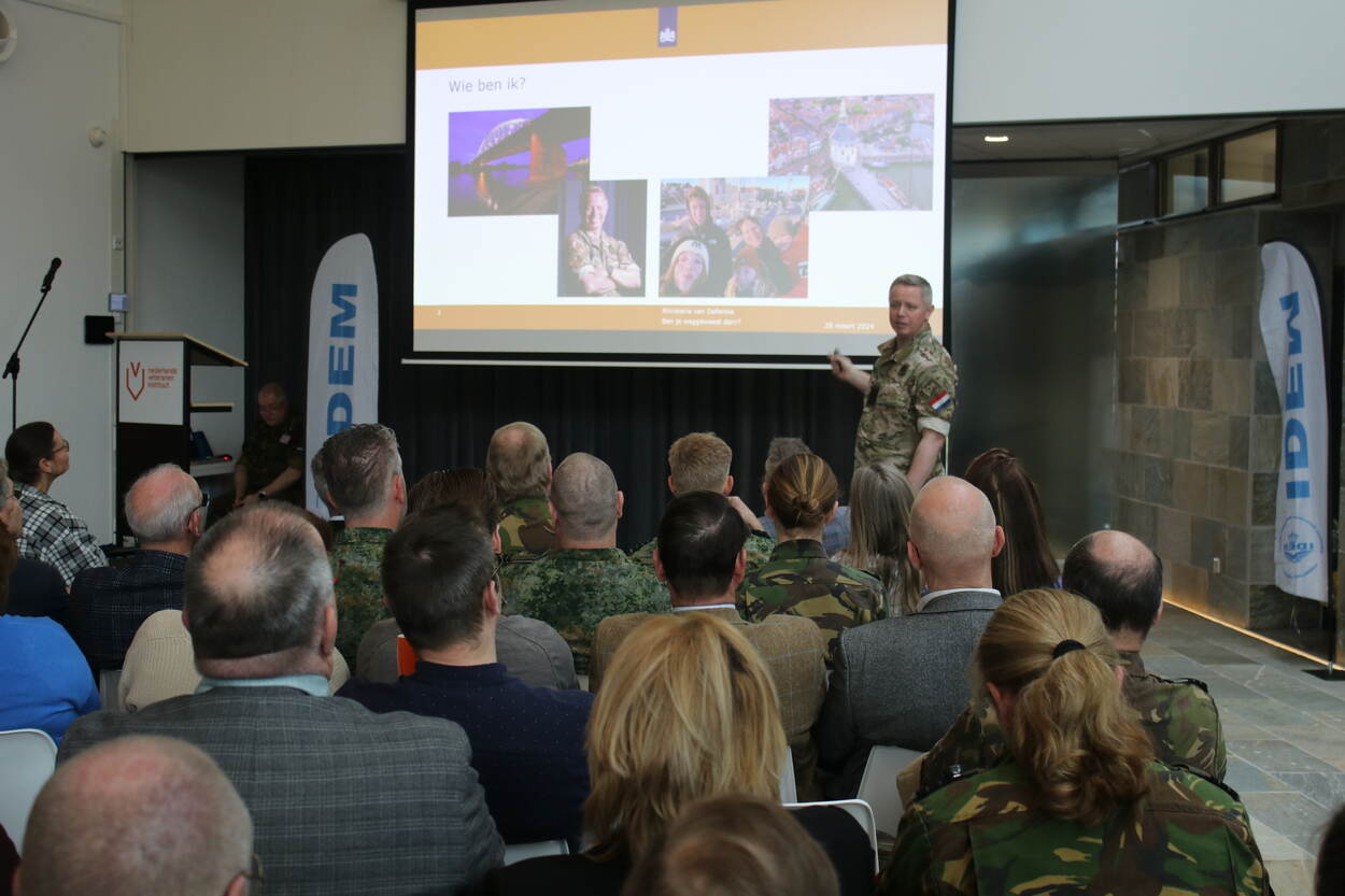 Kolonel Jeroen van Bruchem praat met aanwezigen op IDEM-dag.