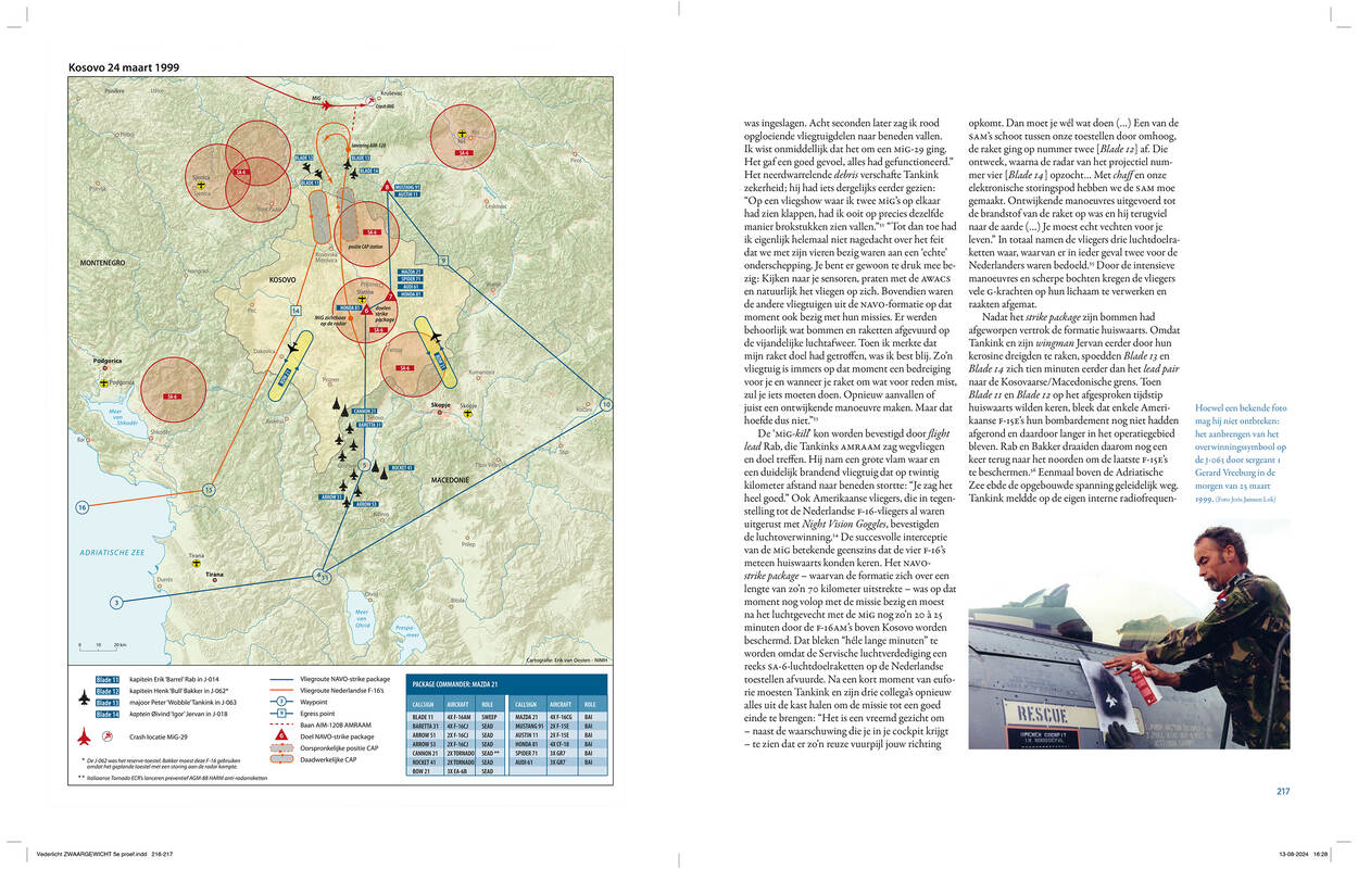 Voor het boek sprak het viertal met ontzettend veel luchtmachtcollega’s, ook b.d.’ers. Van Loo: “De waaier aan bronnen is enorm. We gebruikten archiefmateriaal, open bronnen; alles wat ook maar íets met de F-16 te maken had, bekeken we.” Daardoor staat het boek ook vol onbekendere verhalen én weten de auteurs beslag te leggen op niet eerder gepubliceerde foto’s. Ook een aantal illustraties voegt veel toe. “Onze cartograaf wist in een kaart heel precies uit te beelden hoe F-16’s tijdens de eerste nacht boven Kosovo opereerden. We mailden wel vijftig keer heen en weer met de betrokken vliegers; we vlogen iets naar links, iets naar rechts. Uiteindelijk is het resultaat top.”