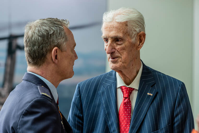 De Koninklijke Luchtmacht Historische Vlucht bracht op de herdenkingsdienst Schröder een laatste groet met een formatie bestaande uit een Beech 19 en twee Harvards. Op de foto Schröder in gesprek met luitenant-generaal Dennis Luyt tijdens zijn commando-overdracht aan luitenant-generaal André Steur op 14 april 2023. Foto: sergeant-majoor Cristian Schrik